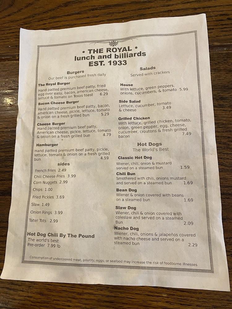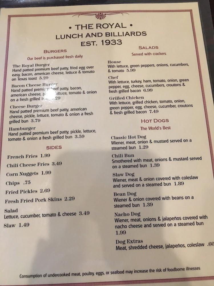 The menu at The Royal Lunch features a delightful array of American classics. Highlighted options include burgers, hot dogs, and various sides. Sandwiches and salads round out the selection, providing something for every palate.